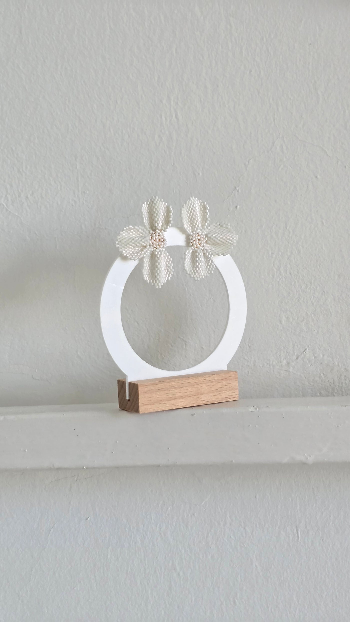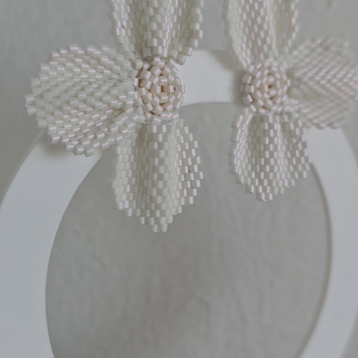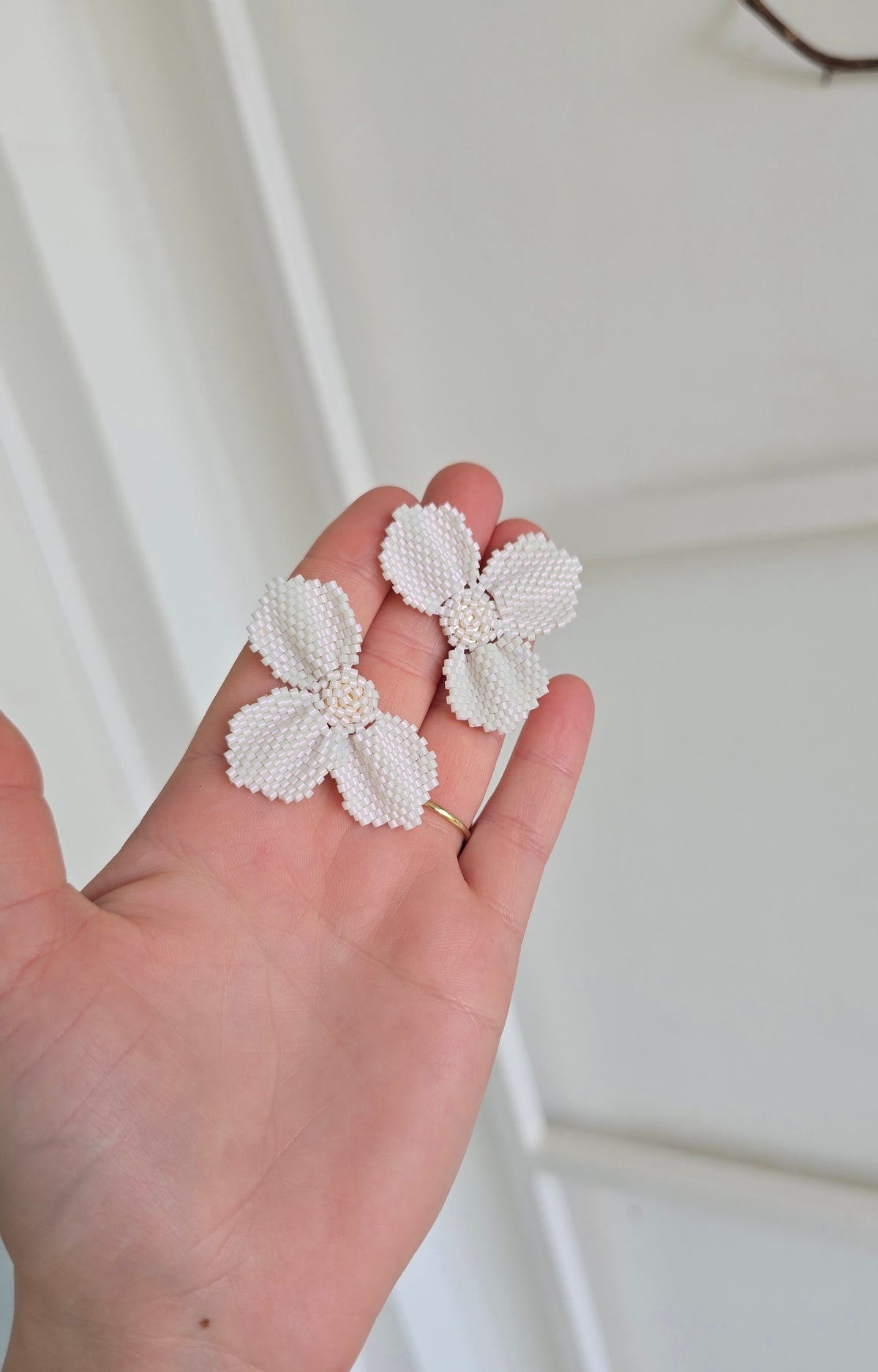 Delicate handmade stud earrings crafted from tiny seed beads. The elegant flower design in a soft milky white shade looks light and refined, adding a touch of femininity to any look.