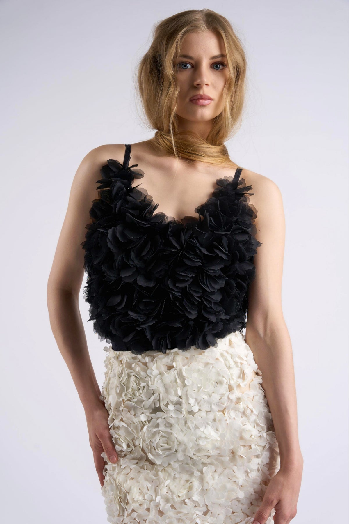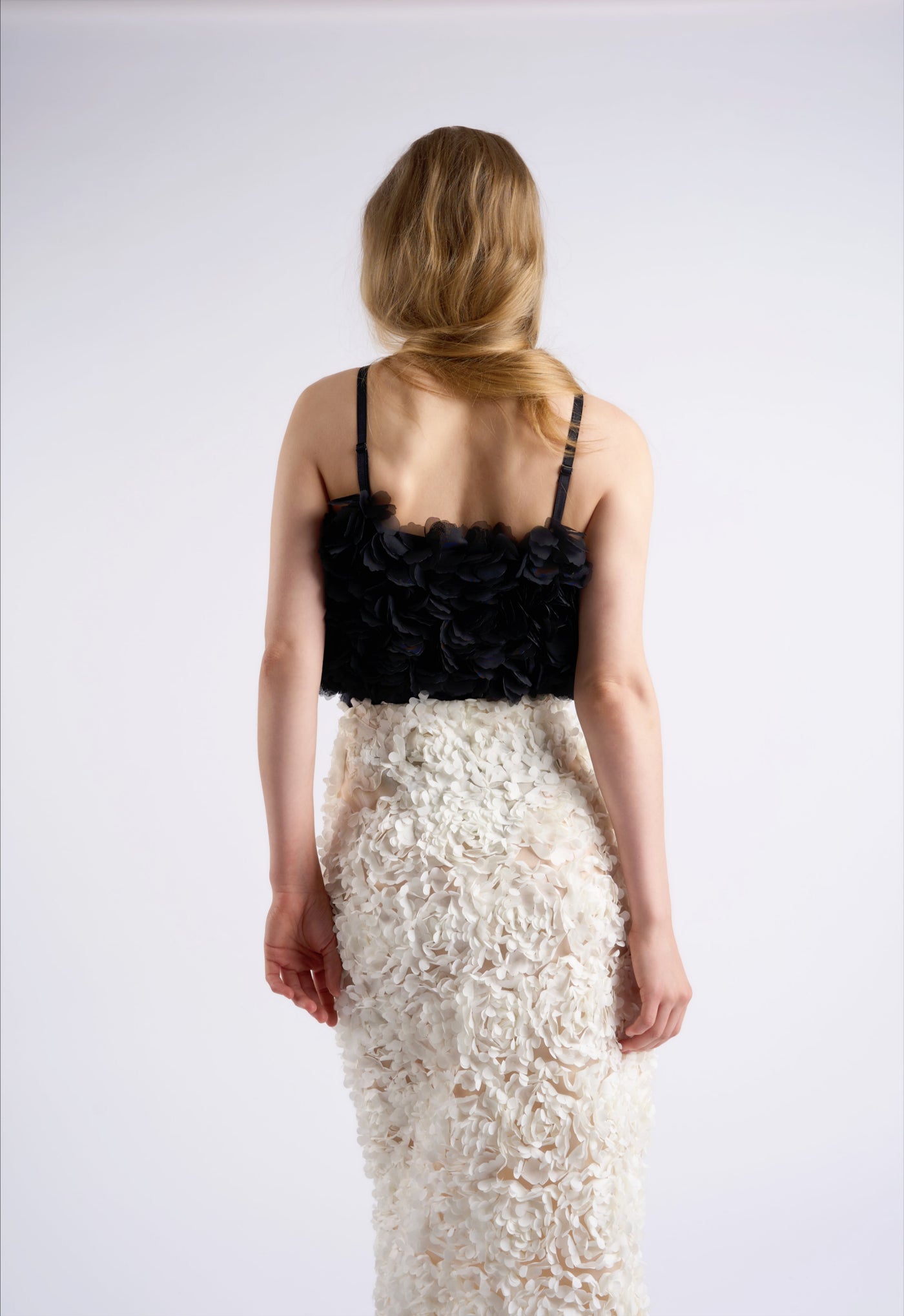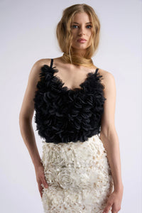 An eye-catching bodysuit, hand-embroidered with voluminous floral elements.