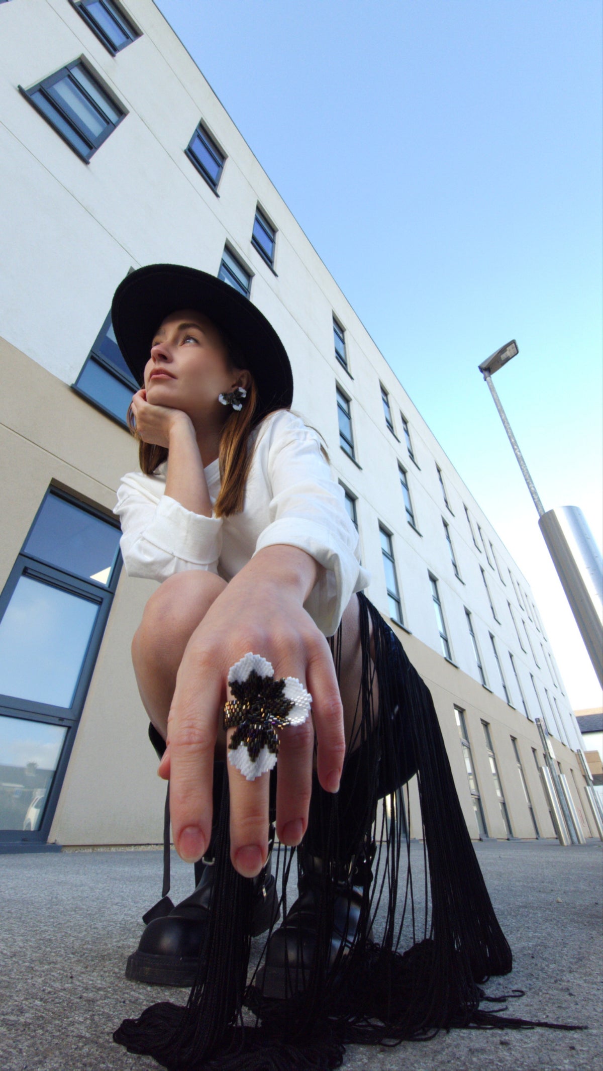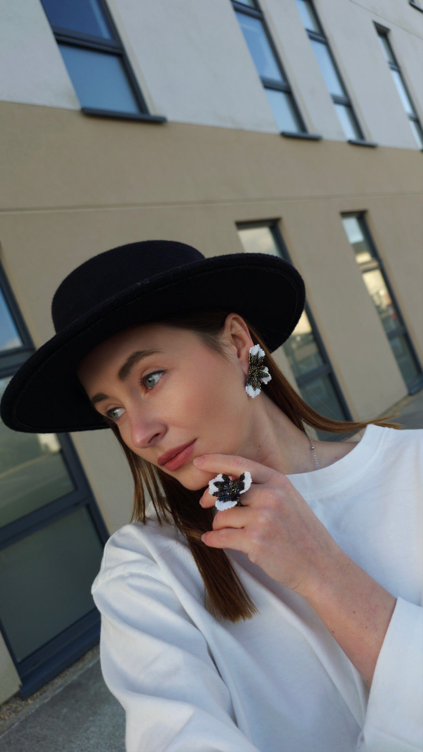 Handmade beaded earrings featuring a striking floral motif. The clean silhouette and contrasting color palette make them a versatile accessory that pairs easily with a wide range of styles.