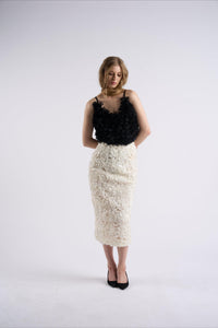 An elegant midi skirt designed to highlight your sophistication and style. The textured fabric with delicate 3D floral appliqués adds refinement and a touch of romantic charm. The pure white shade brings freshness and versatility — making it easy to pair with both classic blouses and evening tops.