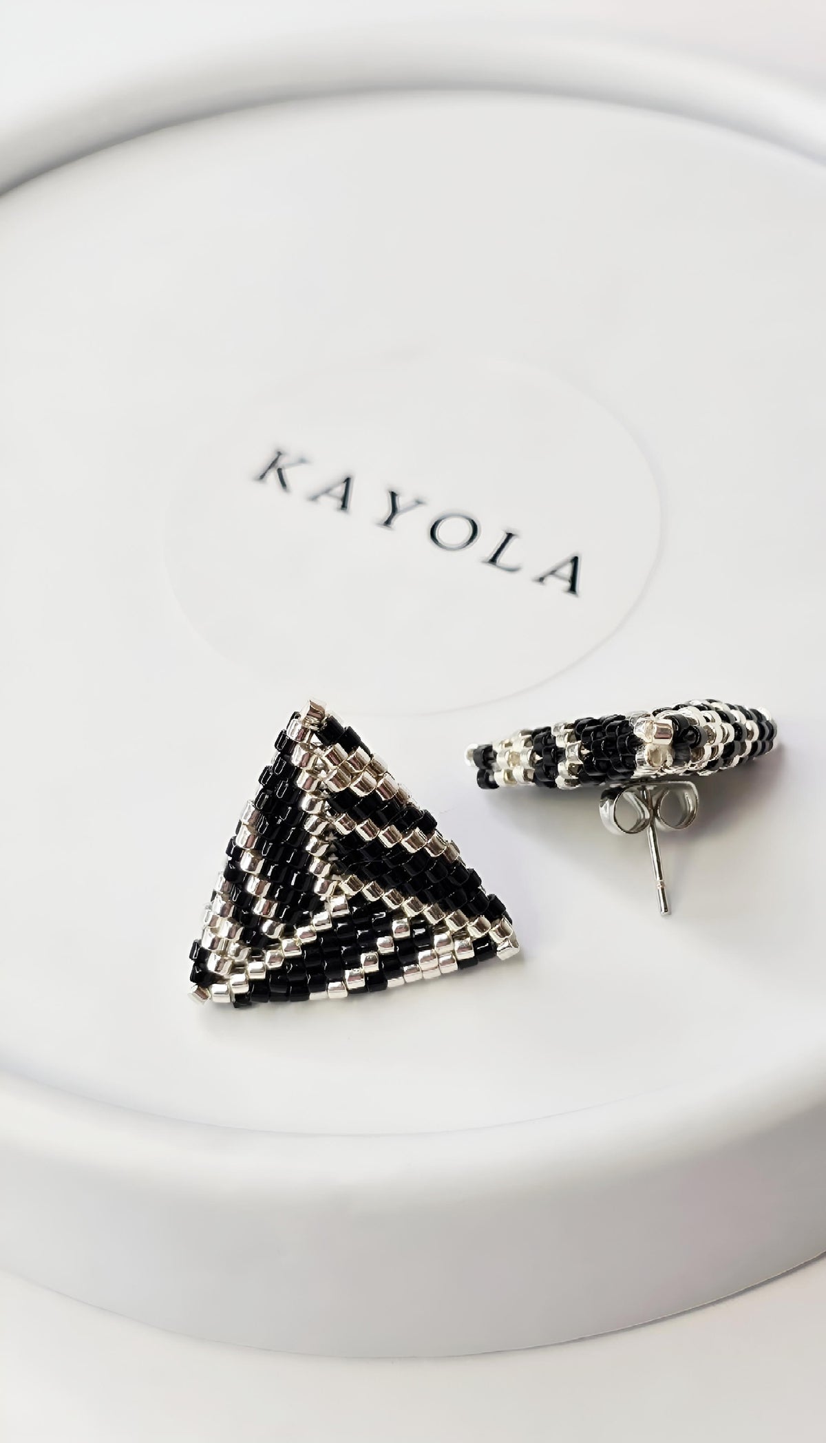 Elegant triangular earrings made from high-quality Japanese seed beads. The neat geometric pattern combines black and metallic shades, creating a stylish modern accent.